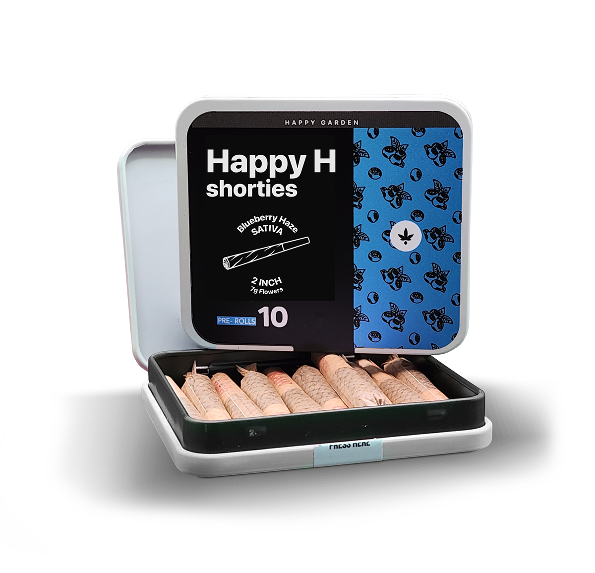 Energie explozivă și aromă dulce de afine într-o singură inhalare. Happy H Blueberry Haze Shorties conțin 10 Pre-Rolls premium fără tutun, care combină puterea revigorantă a unei varietăți Sativa cu molecula revoluționară CBDX.